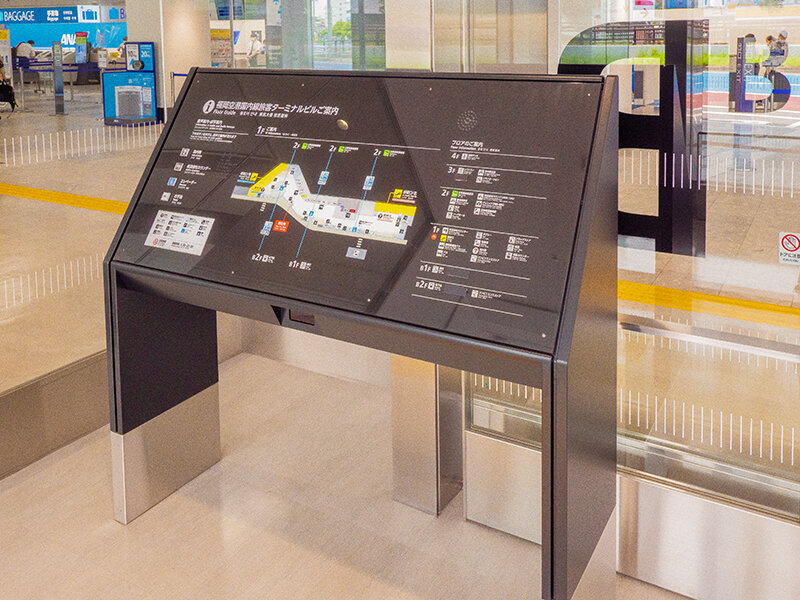 At the terminal entrances, tactile guideboards use Braille and text to explain the airport facilities in a simple manner. Press a button for voice guidance to information desks, restrooms, and the routes to the nearest airline counters.
