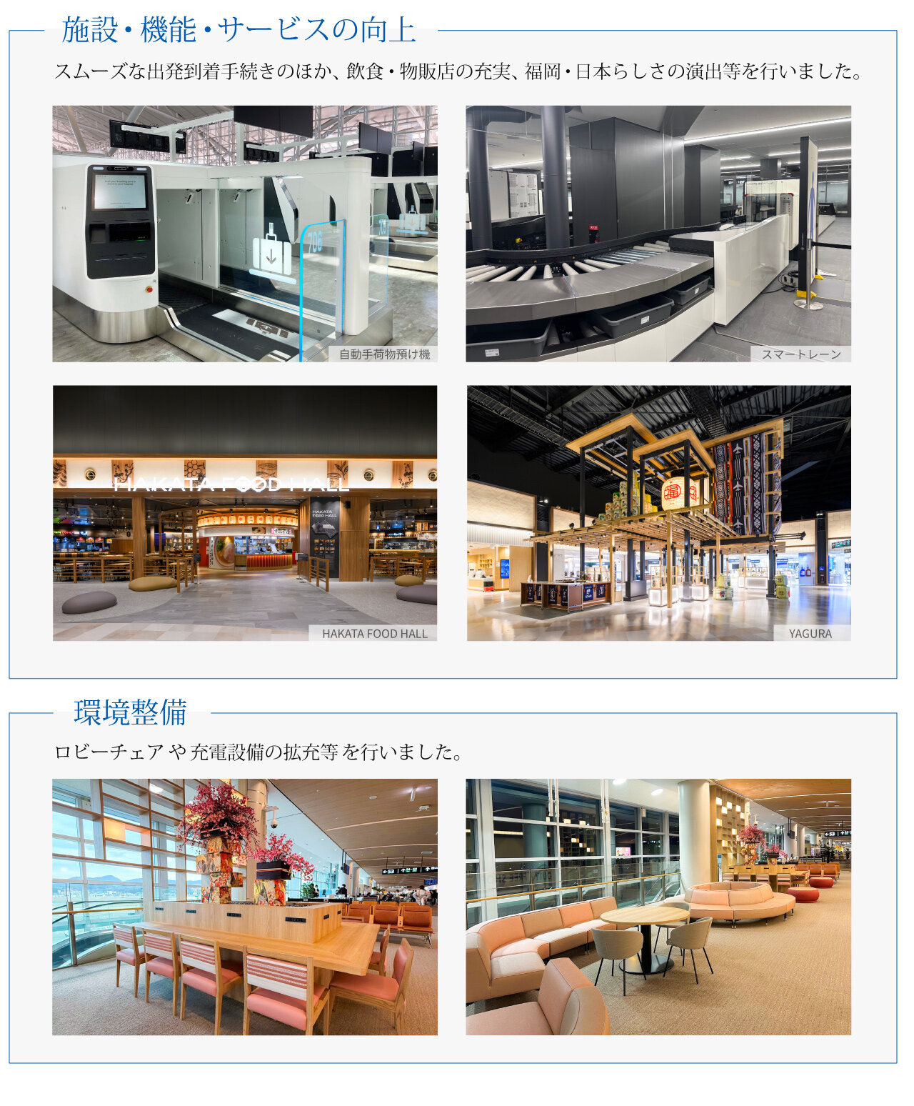 福岡空港は今後も空港内事業者一丸となって、利便性向上や魅力ある施設づくり、空港サービスの質向上に取り組み、お客さまに選ばれる福岡空港の実現を目指してまいります。