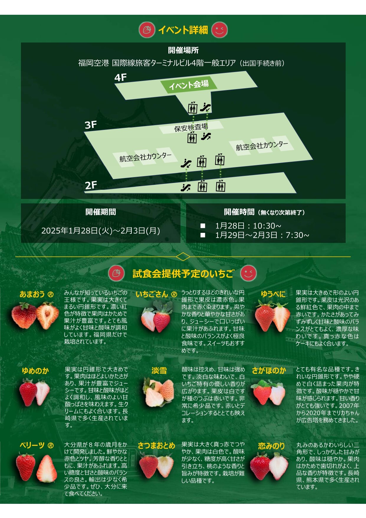 福岡空港国際線旅客ターミナルビル4階において「九州いちご試食イベント」を1/28(火)~2/3(月)の期間開催します!