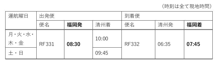 同社は福岡空港へ初就航となり、清州線を運航する航空会社はエアロK、ティーウェイ航空の2社となります。