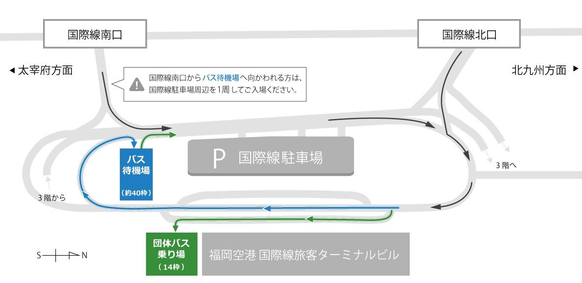 - 福岡空港に当日到着する航空旅客を乗車させるバスのための待機場です。それ以外の目的(近隣商業施設利用時の待機等)でのご利用はお断りしております。
