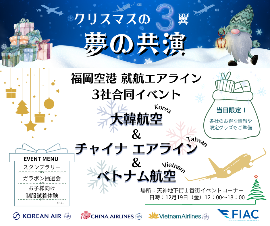 2025年12月19日(金)12時より、福岡空港に就航する大韓航空(韓国)・チャイナエアライン(台湾)・ベトナム航空(ベトナム)の3社によるクリスマスイベントを、天神地下街(1番街イベントコーナー)にて開催いたします。