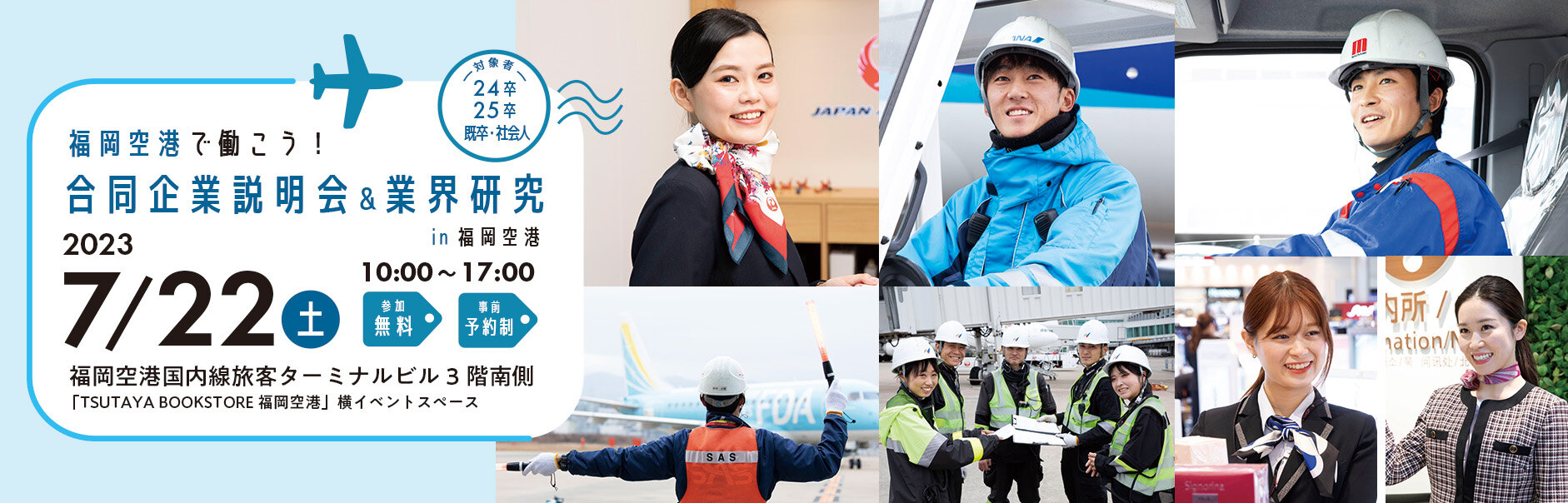 福岡空港では、「福岡空港で働こう!合同企業説明会&業界研究in 福岡空港」を 7/22 (土)に開催します。