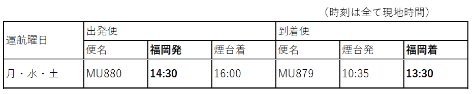中国東方航空が煙台線に就航し、煙台線の運航が再開します(国際線) 12/7(土)~
