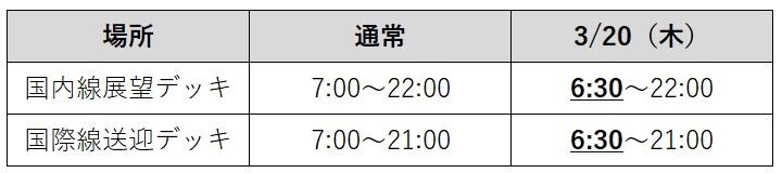 3/20(木)は展望デッキ・送迎デッキを30分早くオープンします