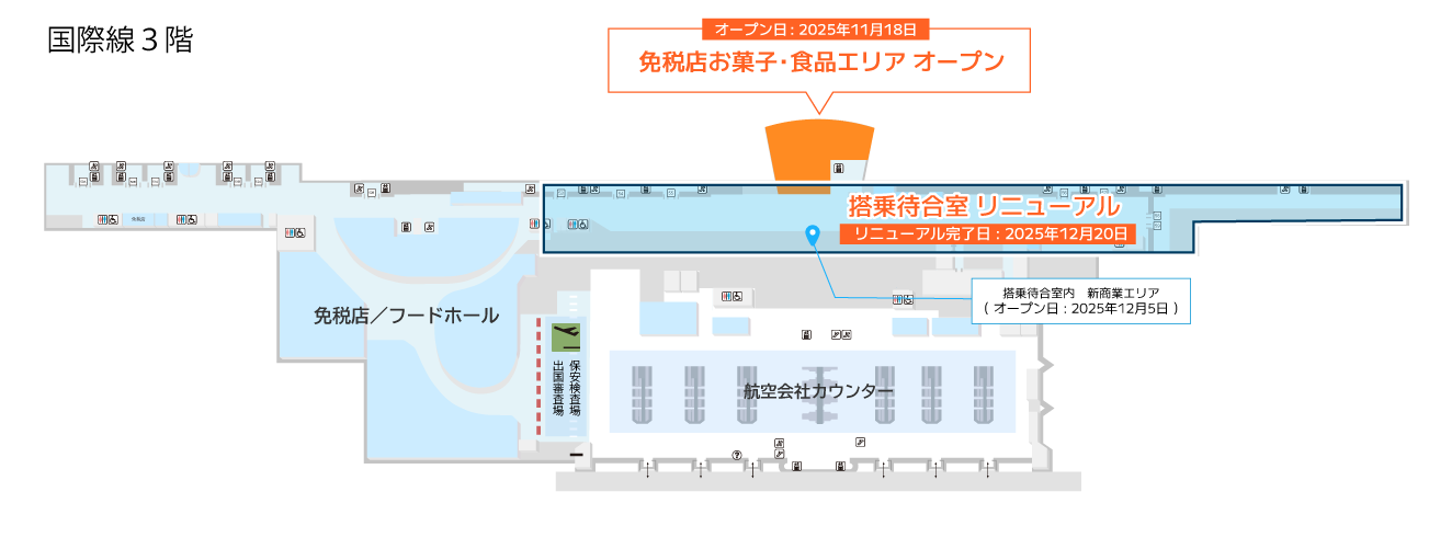 国際線ターミナルビルでは2025年3月のグランドオープン以降、既存エリアの内部改修を進めています。保安検査通過後エリアにおいて、11月18日に免税店お菓子・食品エリアがオープンするほか、12月5日には13の新店舗がオープンし、12月20日に搭乗待合室の改装工事が完了予定です。これをもって2022年5月から行ってきた国際線ターミナルビル等増改築工事が完了します!