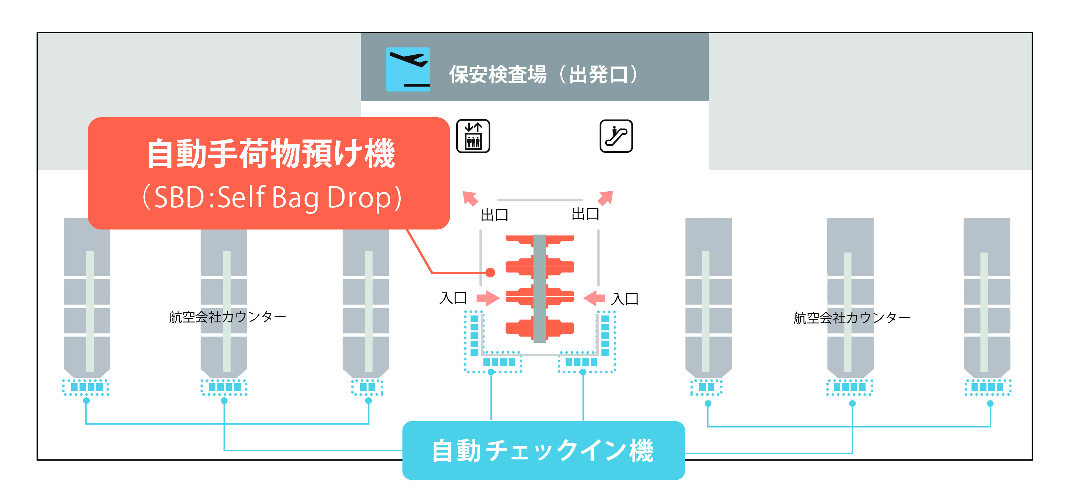 SBDでは、お客さまご自身でキャリーケース等の手荷物をお預けいただけます。自動チェックイン機とSBDをご利用いただくことで、航空会社カウンターに立ち寄ることなく手続きを行うことができます。
