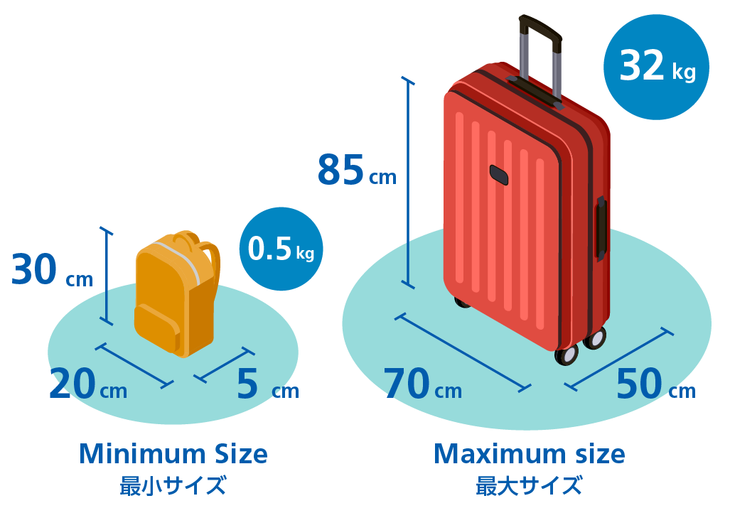 ※上記範囲内であっても、航空会社の重量/サイズ規定を超過した場合、料金が発生します。