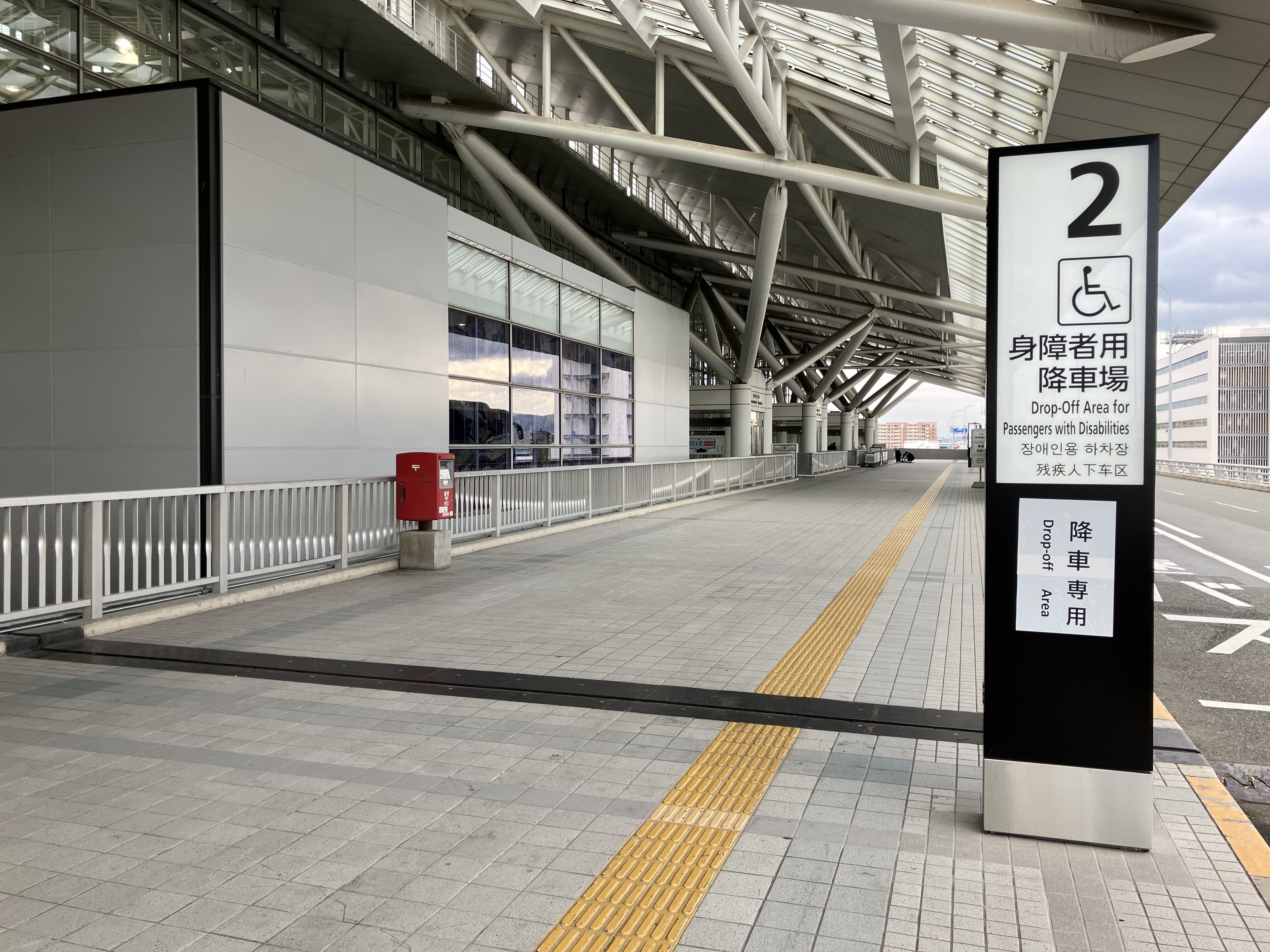 こちらの降り場は、車道と歩道の段差をなくし、スロープとなっております。車いす等をお使いのお客さまの車の降車にご利用ください。