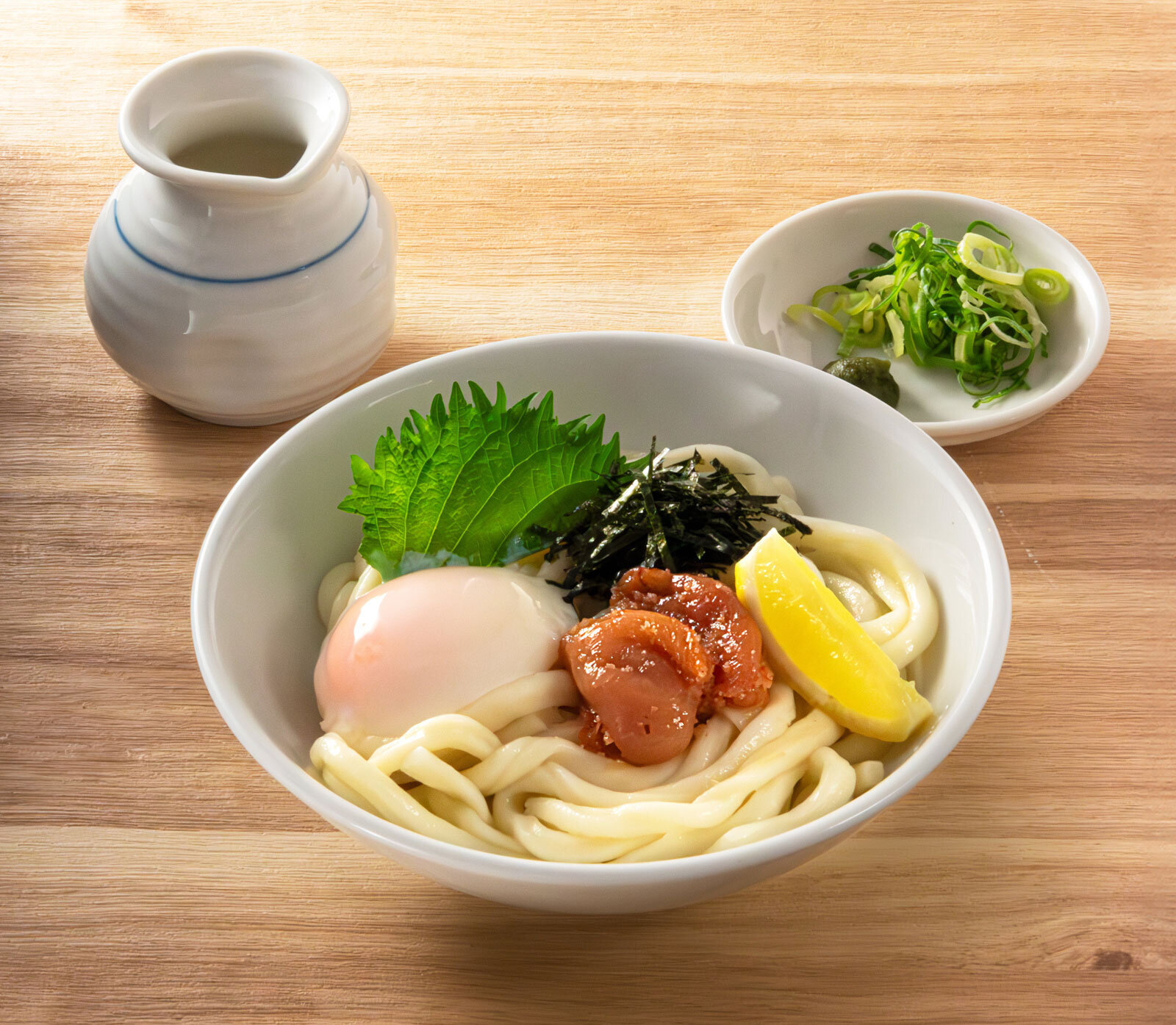 トッピングとして、因幡の出汁で漬け込んだ明太子、半熟玉子、大葉、海苔、レモンを組み合わせました。