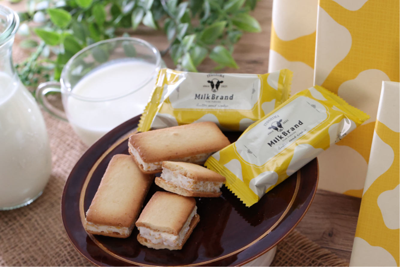 自然豊かな福岡・糸島市のノンホモ牛乳『伊都物語』を使用したお菓子。牛柄パッケージはインパクト大。