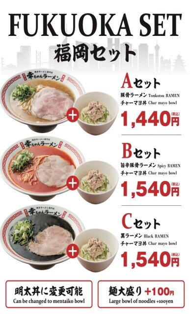 お好きなラーメン(豚骨ラーメン、旨辛豚骨ラーメン、黒ラーメン)とサイドメニューで1番人気のチャーマヨ丼を組み合わせた定番セット。