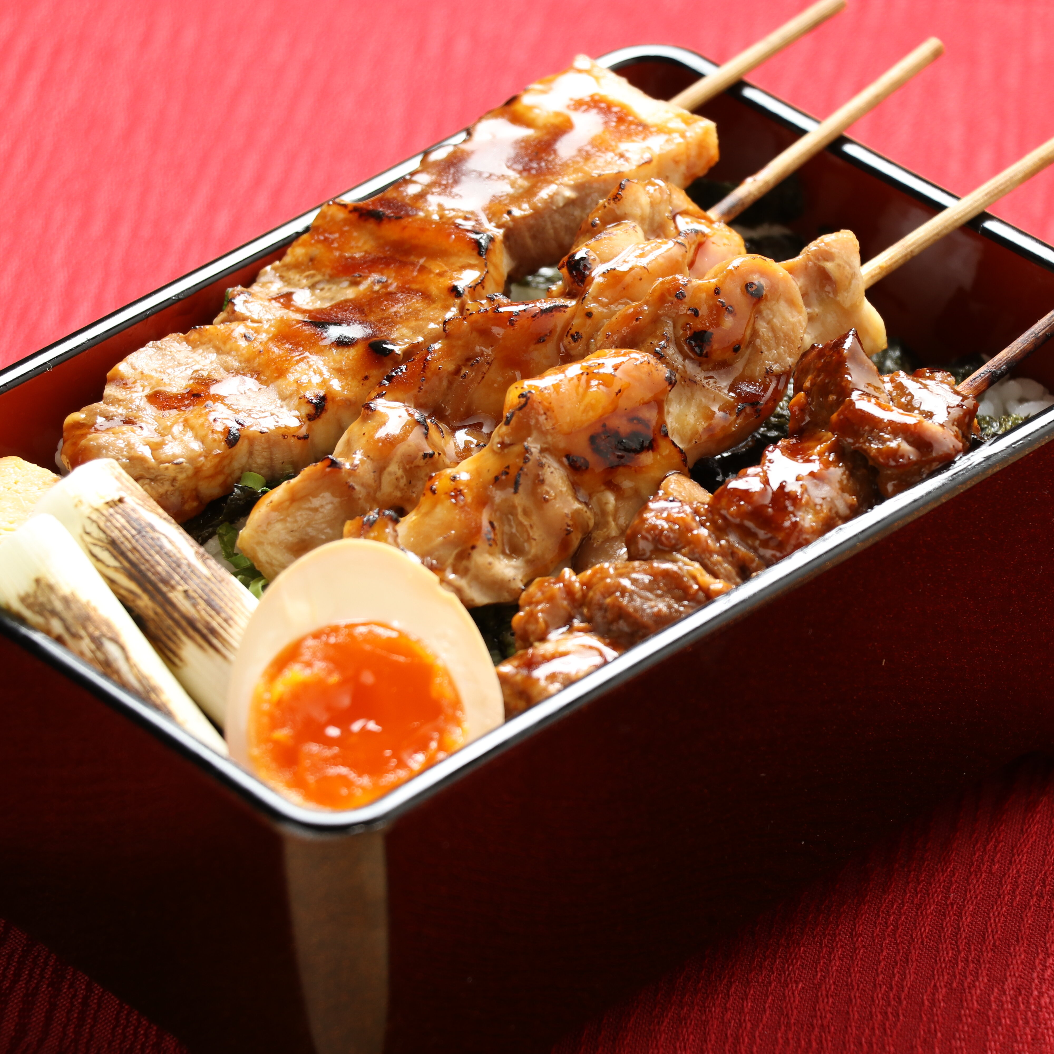 竹乃屋名物焼き鳥重御膳。焼き上げた焼き鳥を秘伝のタレに付けて仕上げております。