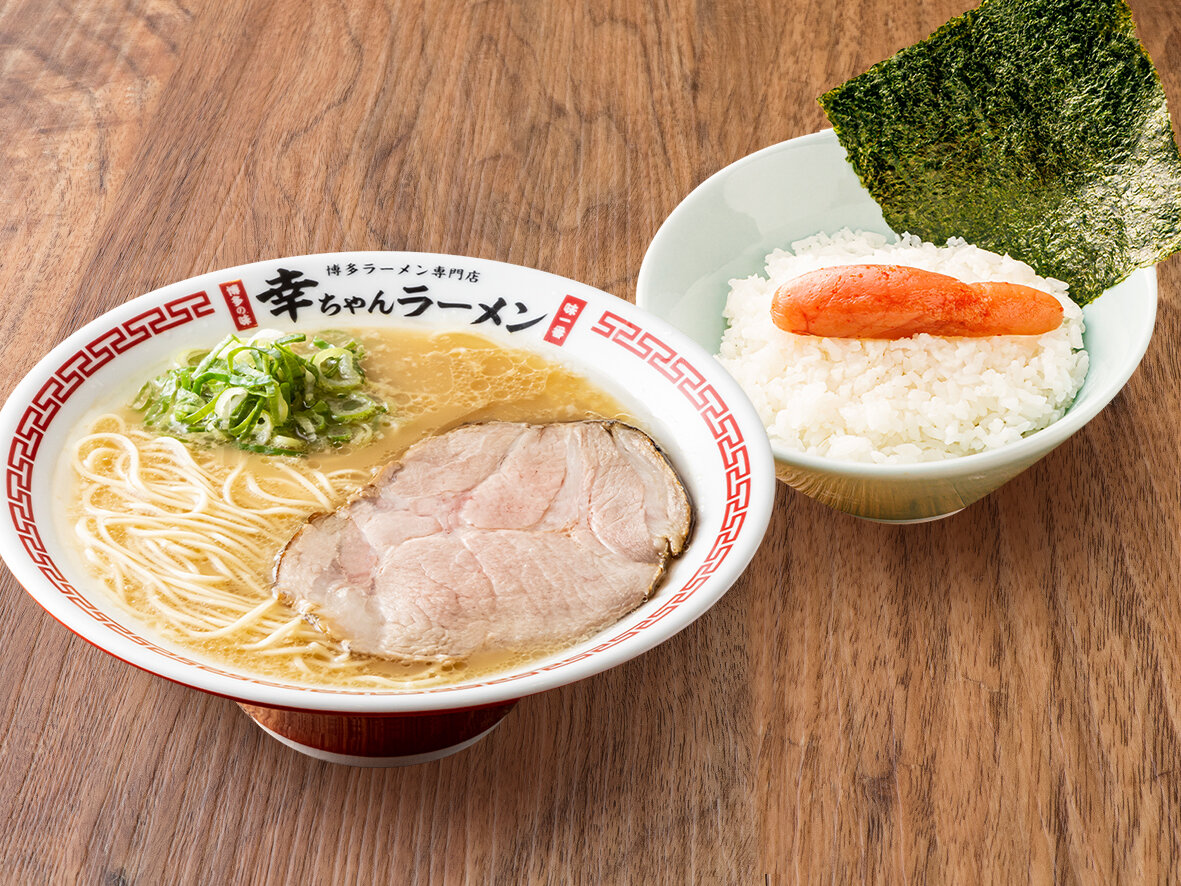 可以同時品嚐到博多美食豚骨拉麵和明太子。